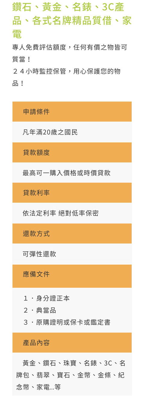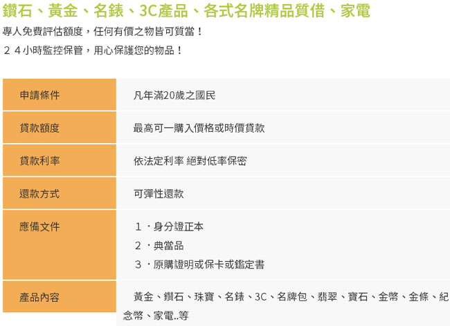 2.利息(以當舖法規定為準) : 月息最低1%~最高2.5%[年利率最低12%最高30%] (提早結清以日計算,無違約金)